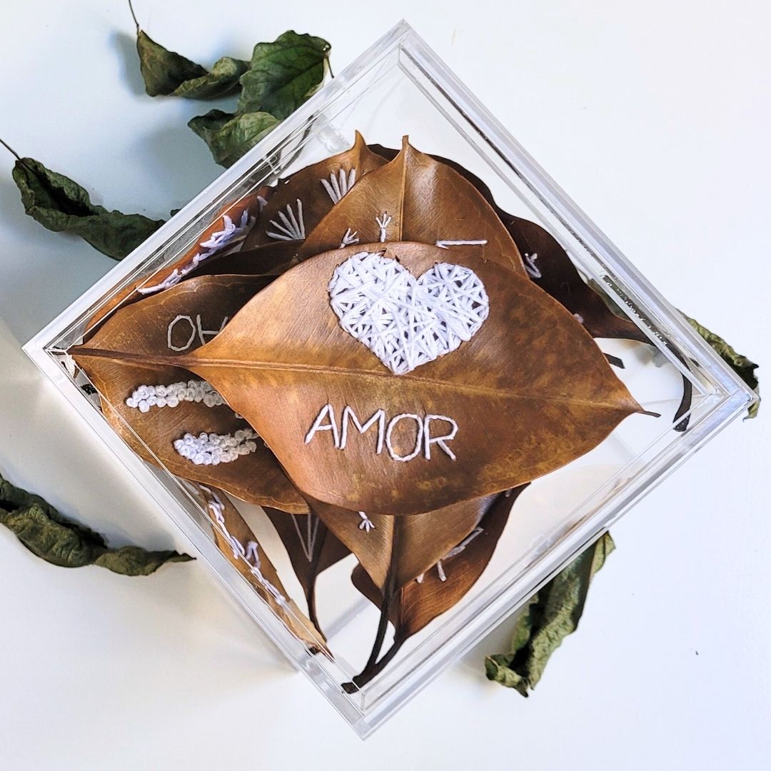 10 folhas bordadas com medida aproximada de 15cm. Caixa acrílica na medida de 15 x 15 x 10cm.