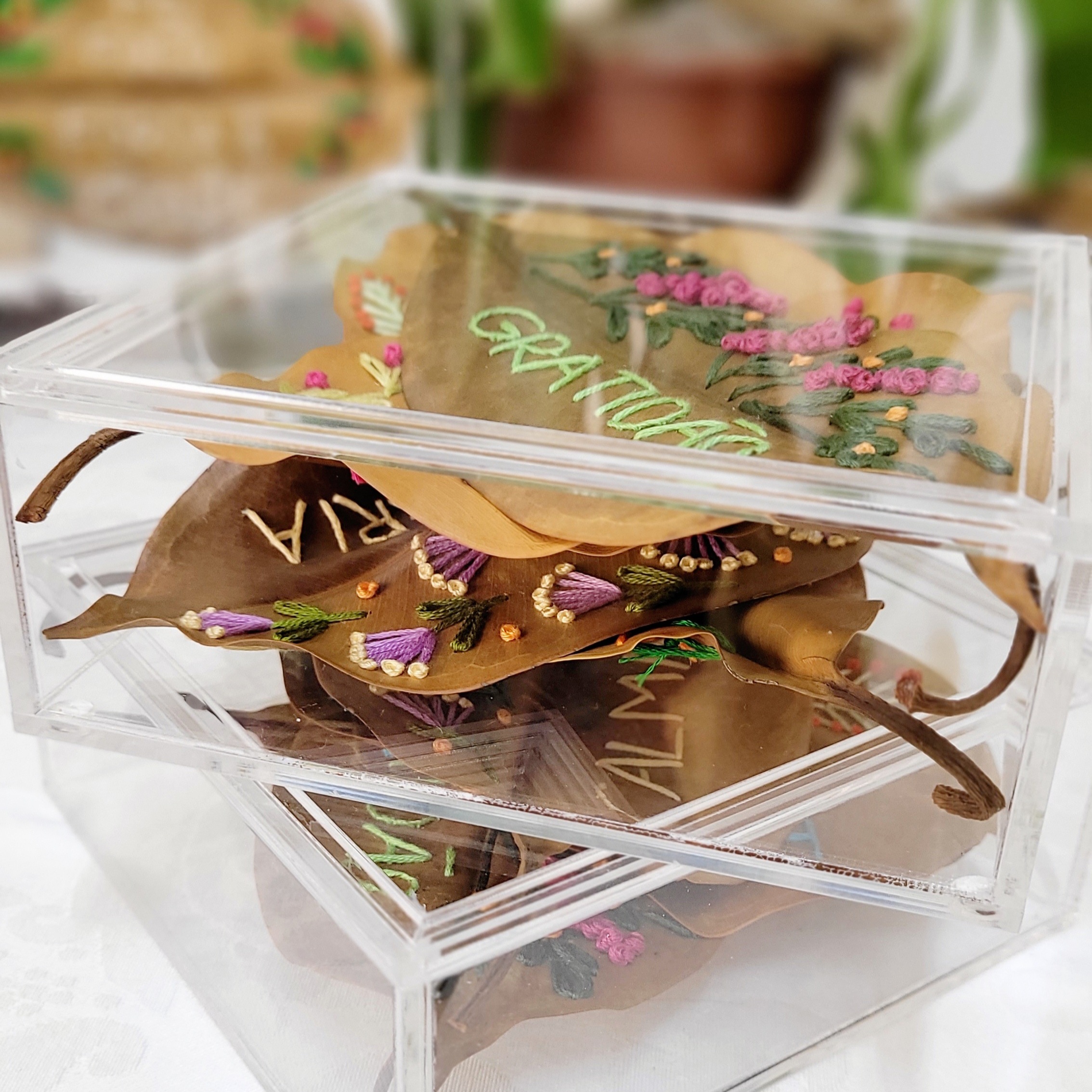5 folhas bordadas com medida aproximada de 15cm. Caixa acrílica na medida de 15 x 15 x 5 cm.