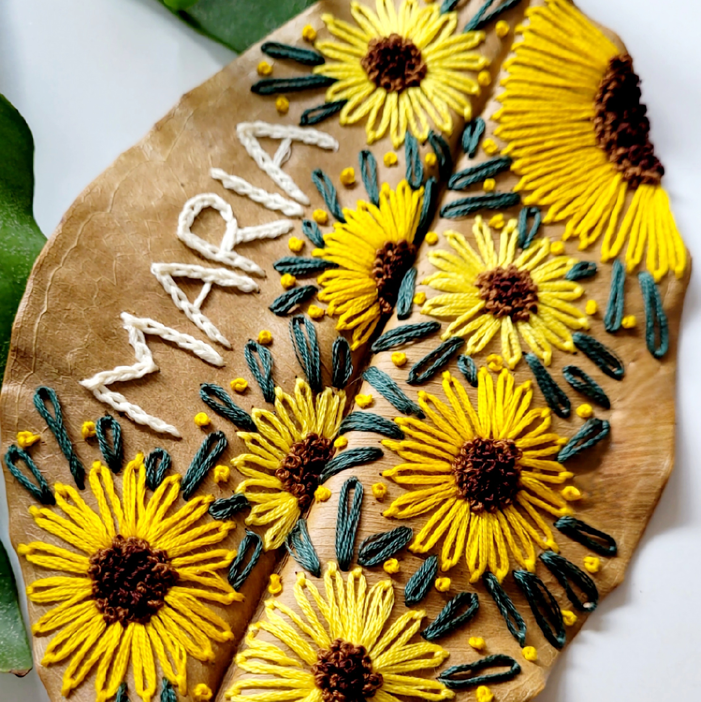 Folha de árvore natural bordada à mão Campo de Girassol. Palavra personalizável.