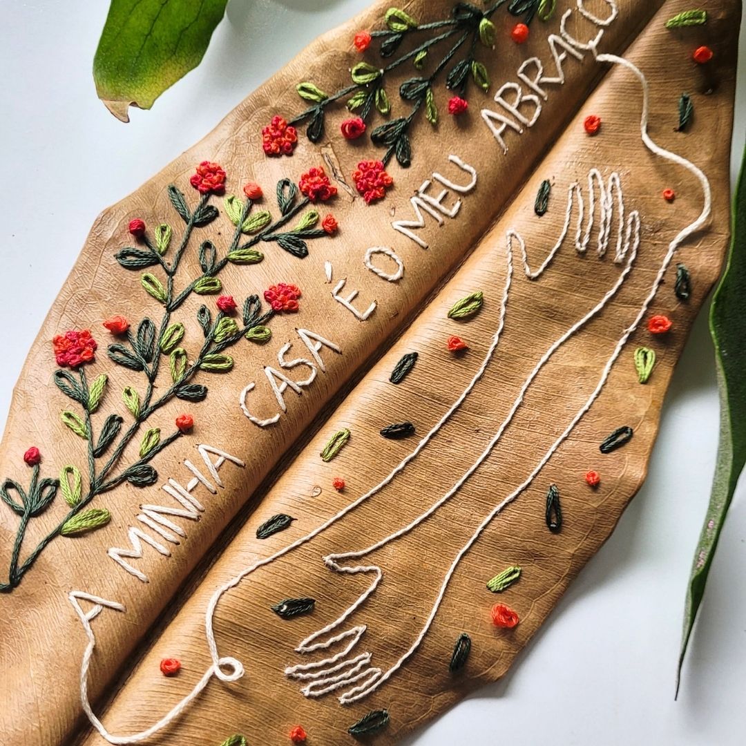 Folha de árvore natural bordada à mão com florais, frase e abraço.
