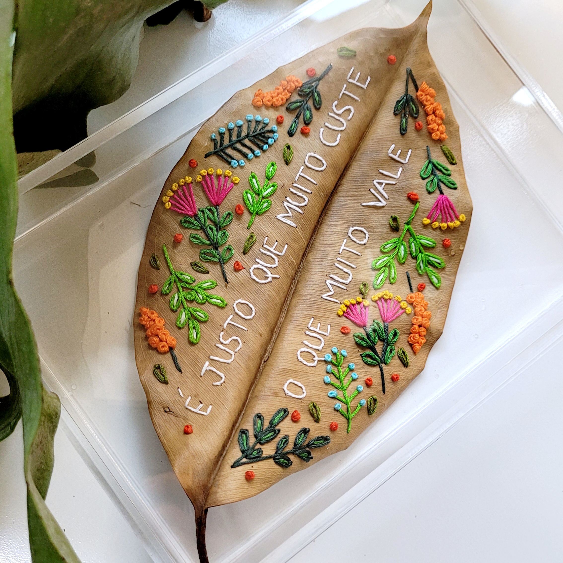 Folha de árvore natural bordada à mão com florais, frase e cores personalizáveis.