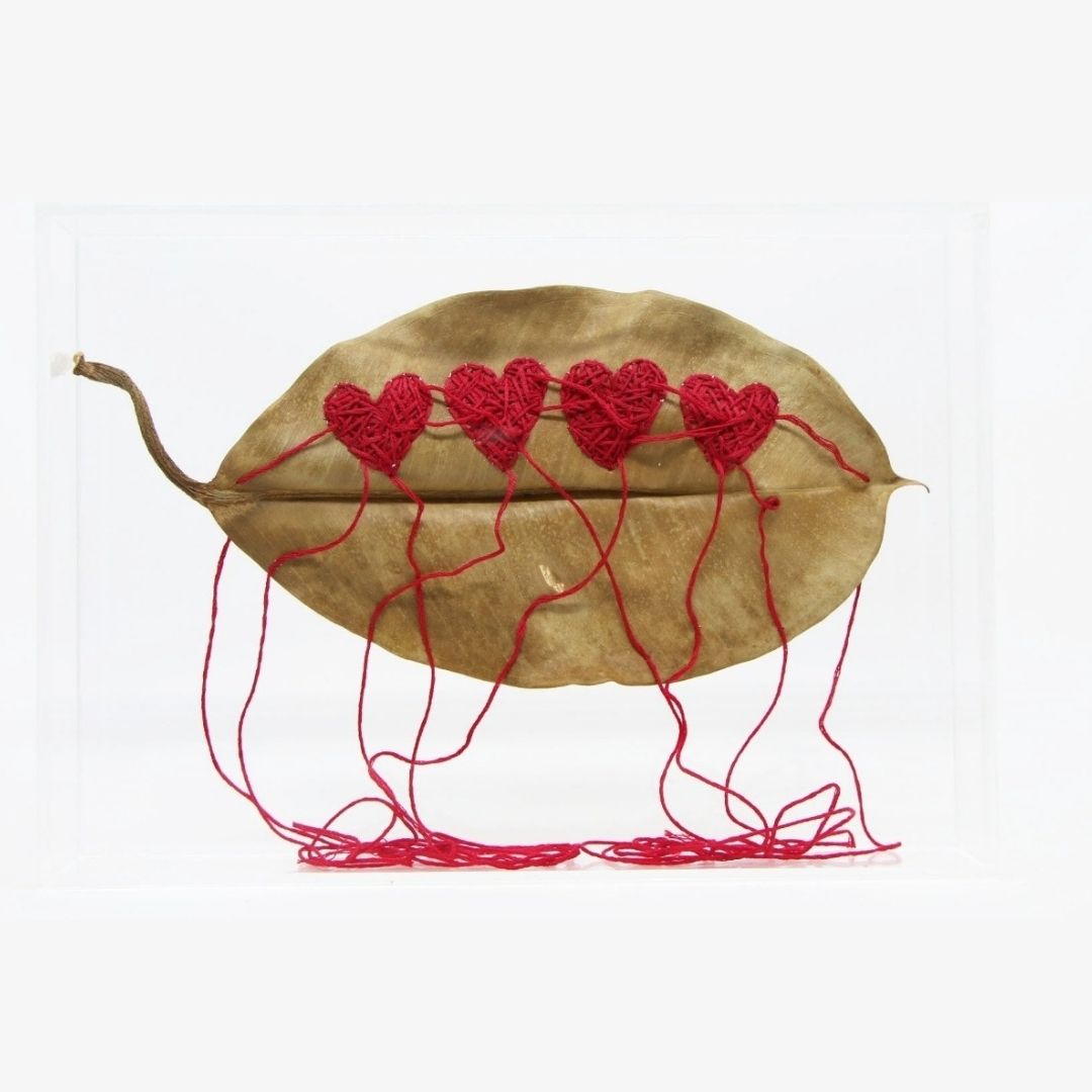 Folha de árvore natural bordada à mão com corações.