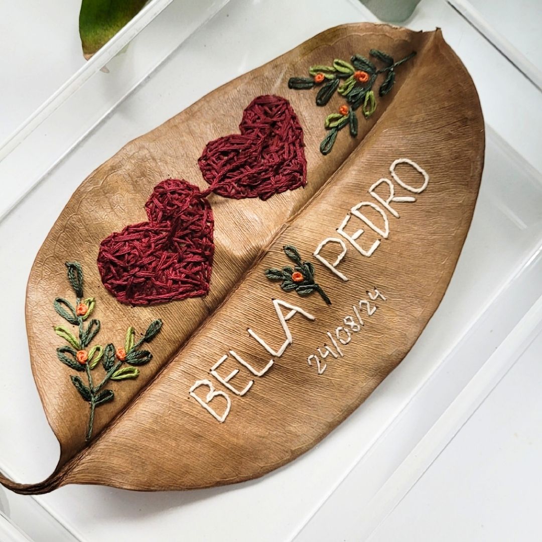 Folha de árvore natural bordada à mão com dois corações unidos.