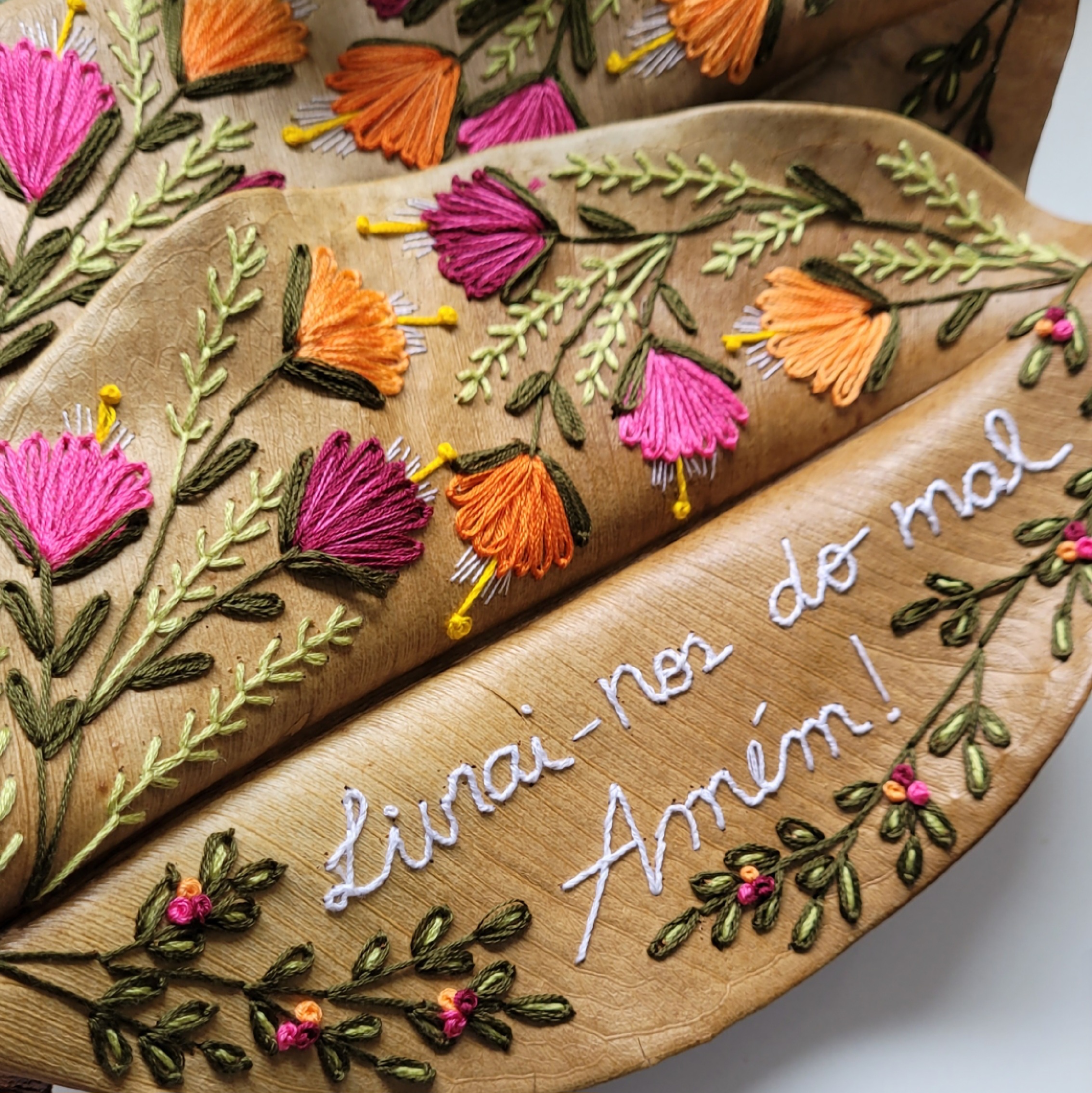 Folha de árvore natural bordada à mão com florais diversos e frases personalizáveis