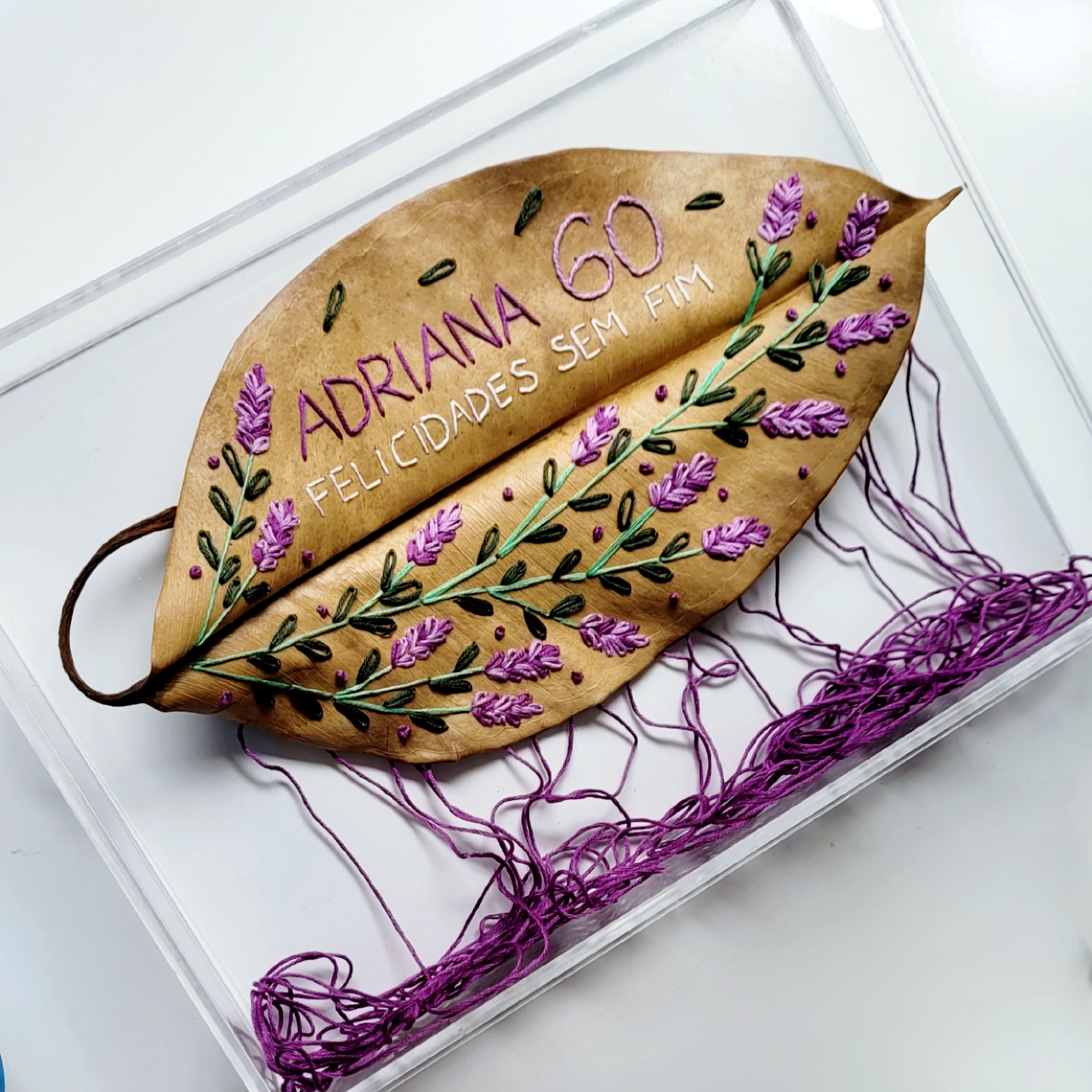 Folha de árvore natural bordada à mão com florais e fios soltos.