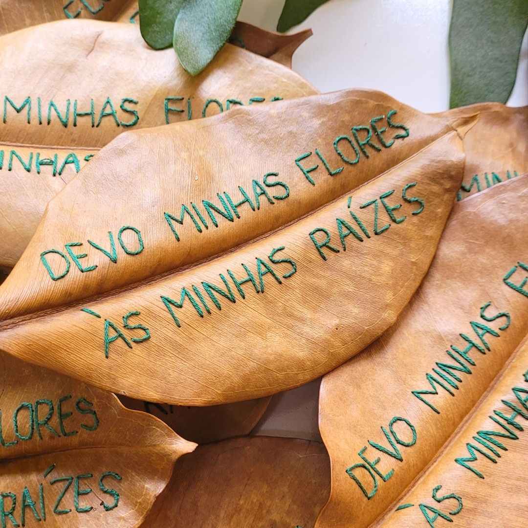 Folha de árvore natural bordada à mão com frase personalizável.