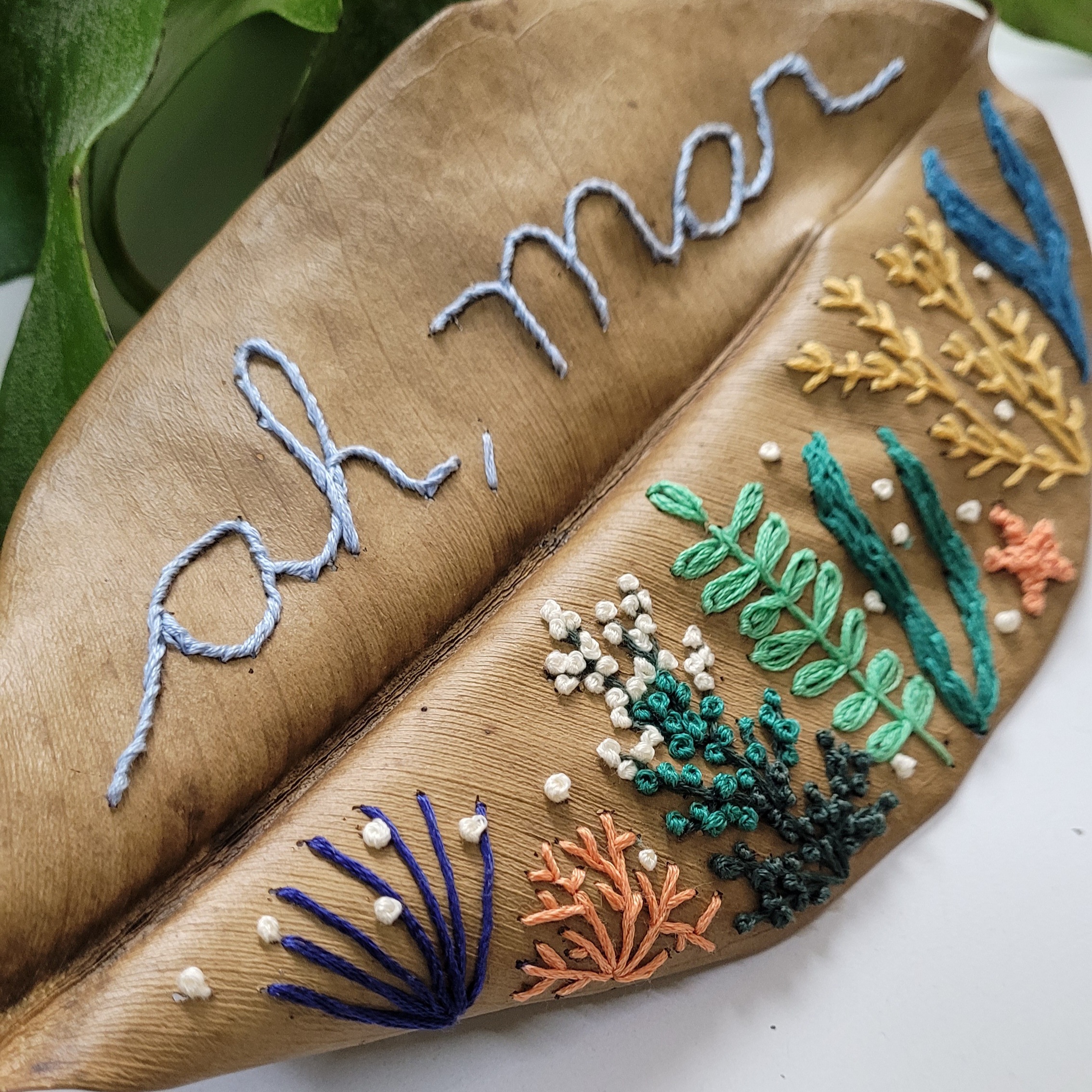 Folha de árvore natural bordada à mão fundo do mar.