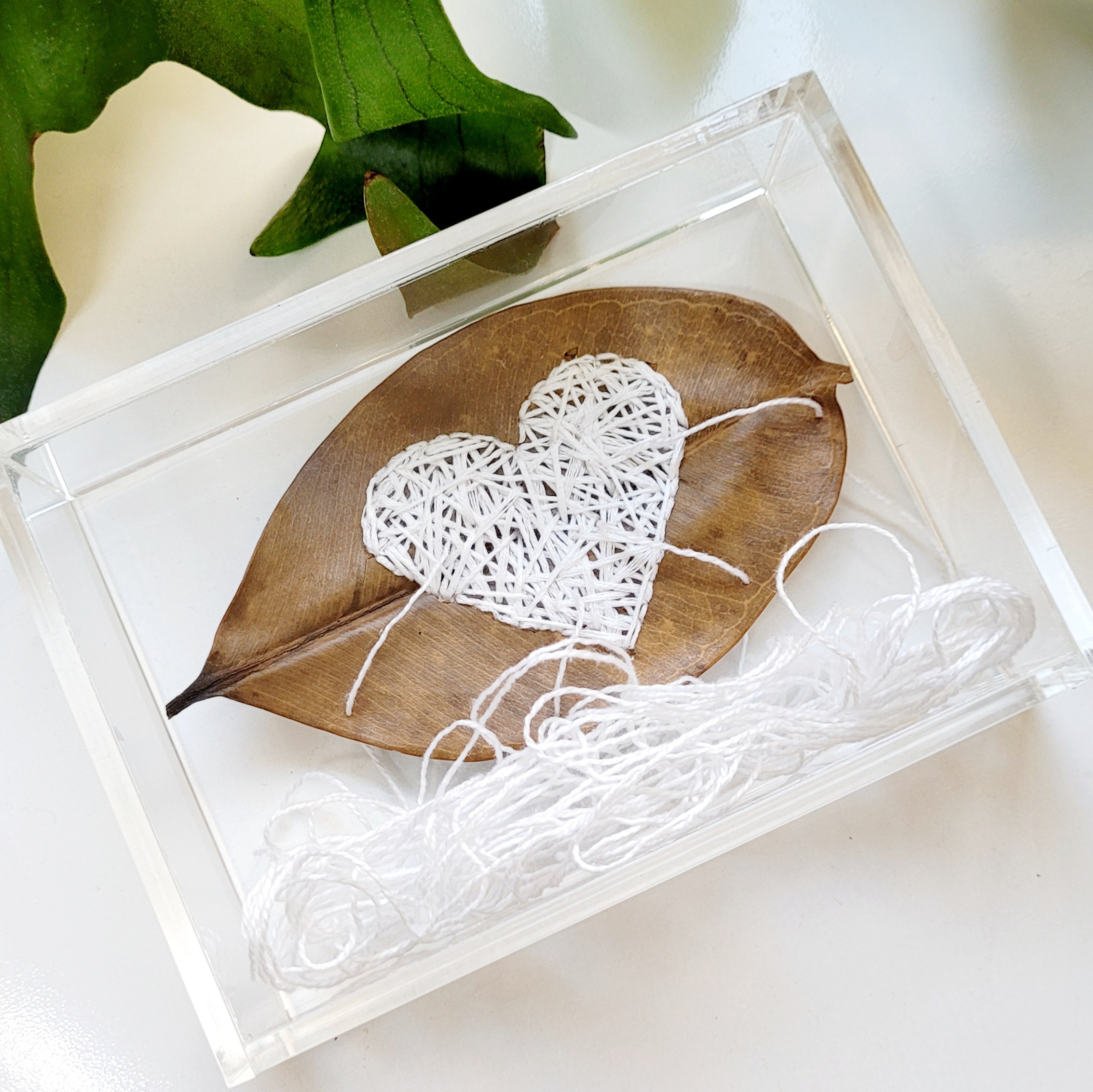 Folha de árvore natural bordada à mão. Acompanha caixa acrílica na medida de 10 x 15 x 4cm.
