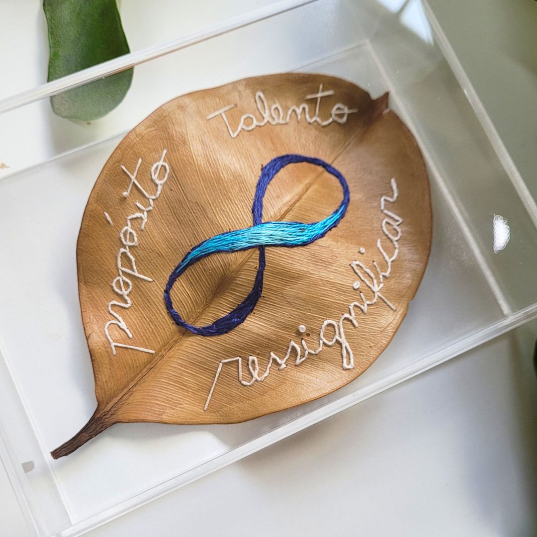 Folha de árvore natural bordada à mão. Acompanha caixa acrílica na medida de 10 x 15 x 4cm.