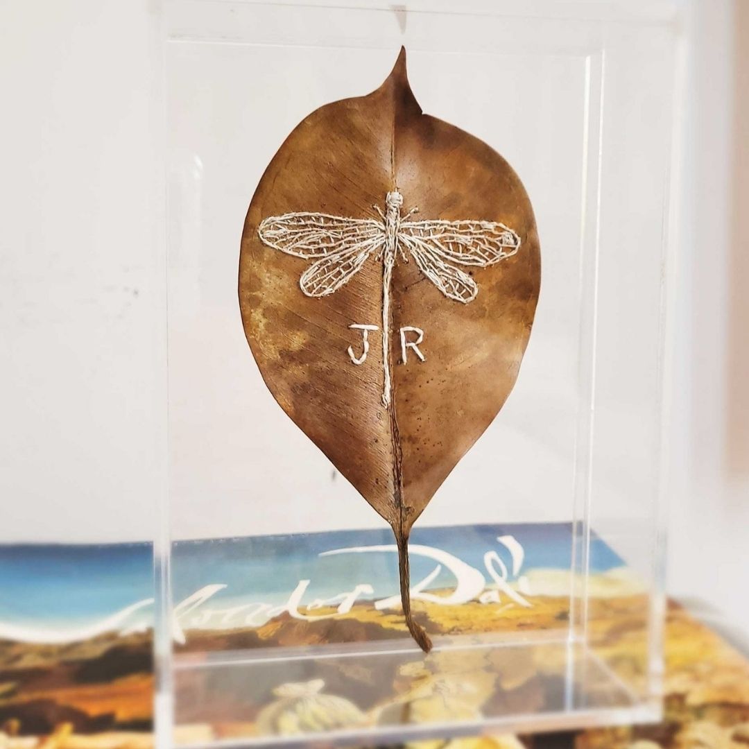 Folha de árvore natural bordada à mão. Acompanha caixa acrílica na medida de 10 x 15 x 4cm.