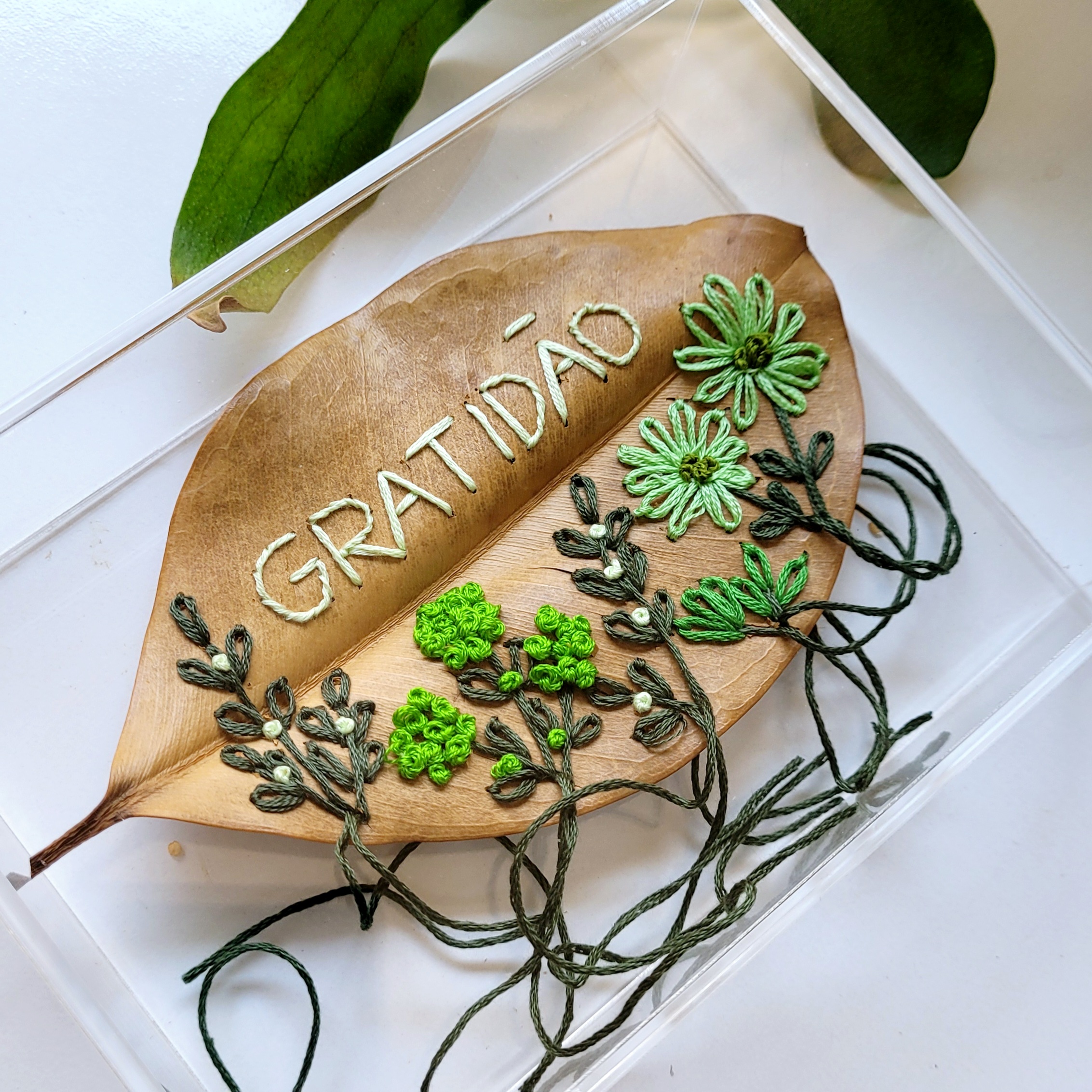 Folha de árvore natural bordada à mão. Acompanha caixa acrílica na medida de 10 x 15 x 4cm.