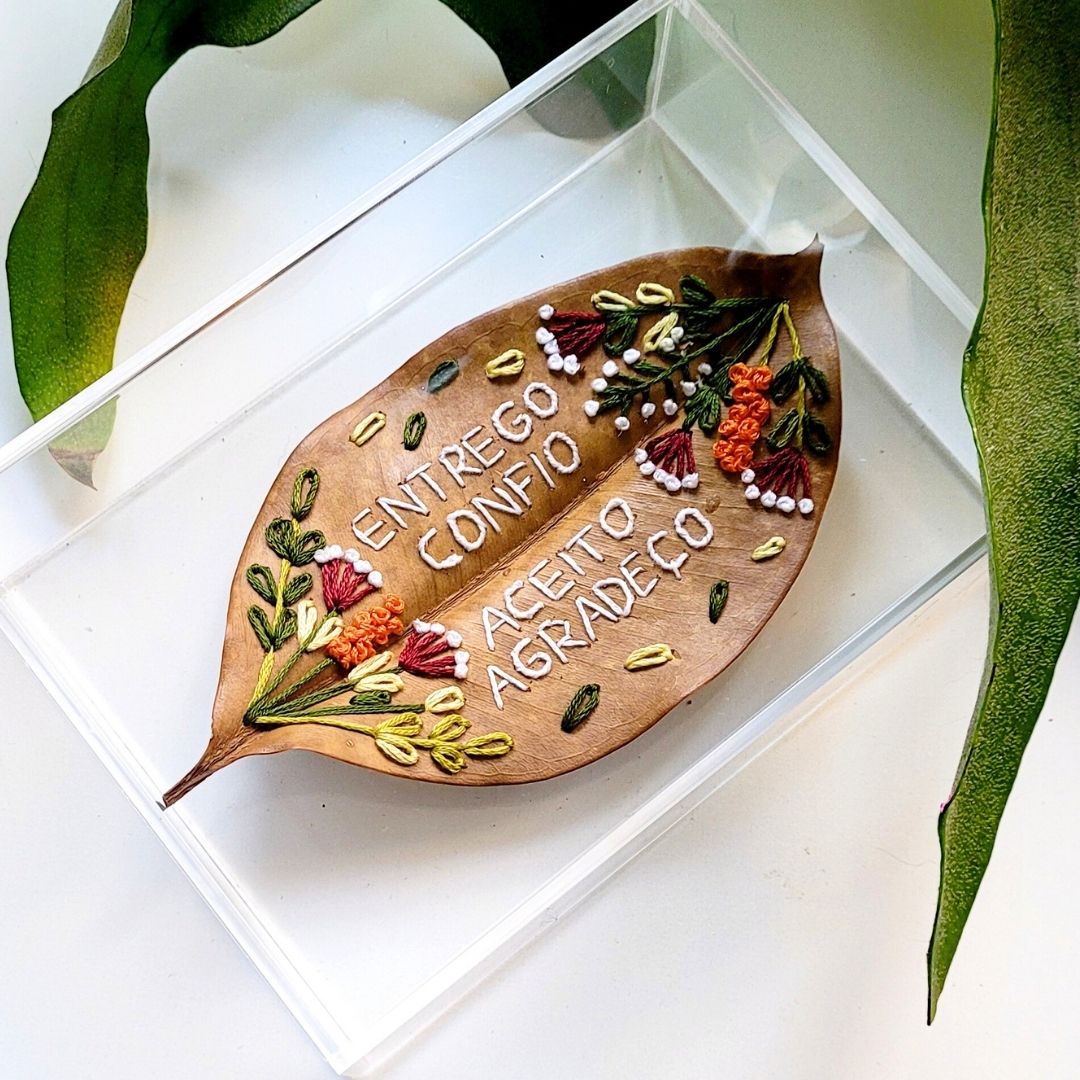 Folha de árvore natural bordada à mão. Acompanha caixa acrílica na medida de 10 x 15 x 4cm.