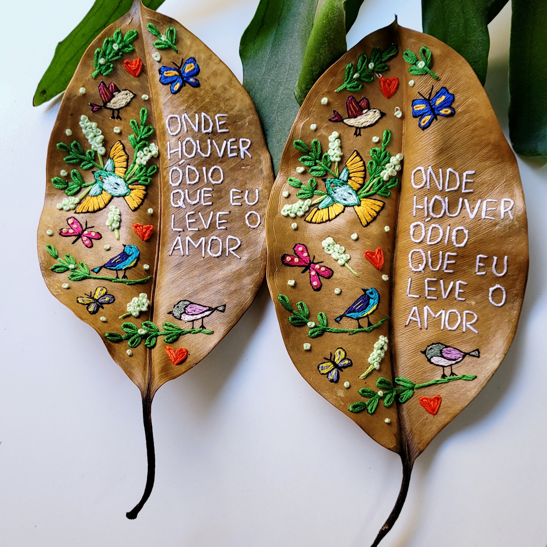 Folha de árvore natural bordada à mão com oração de São Francisco de Assis.