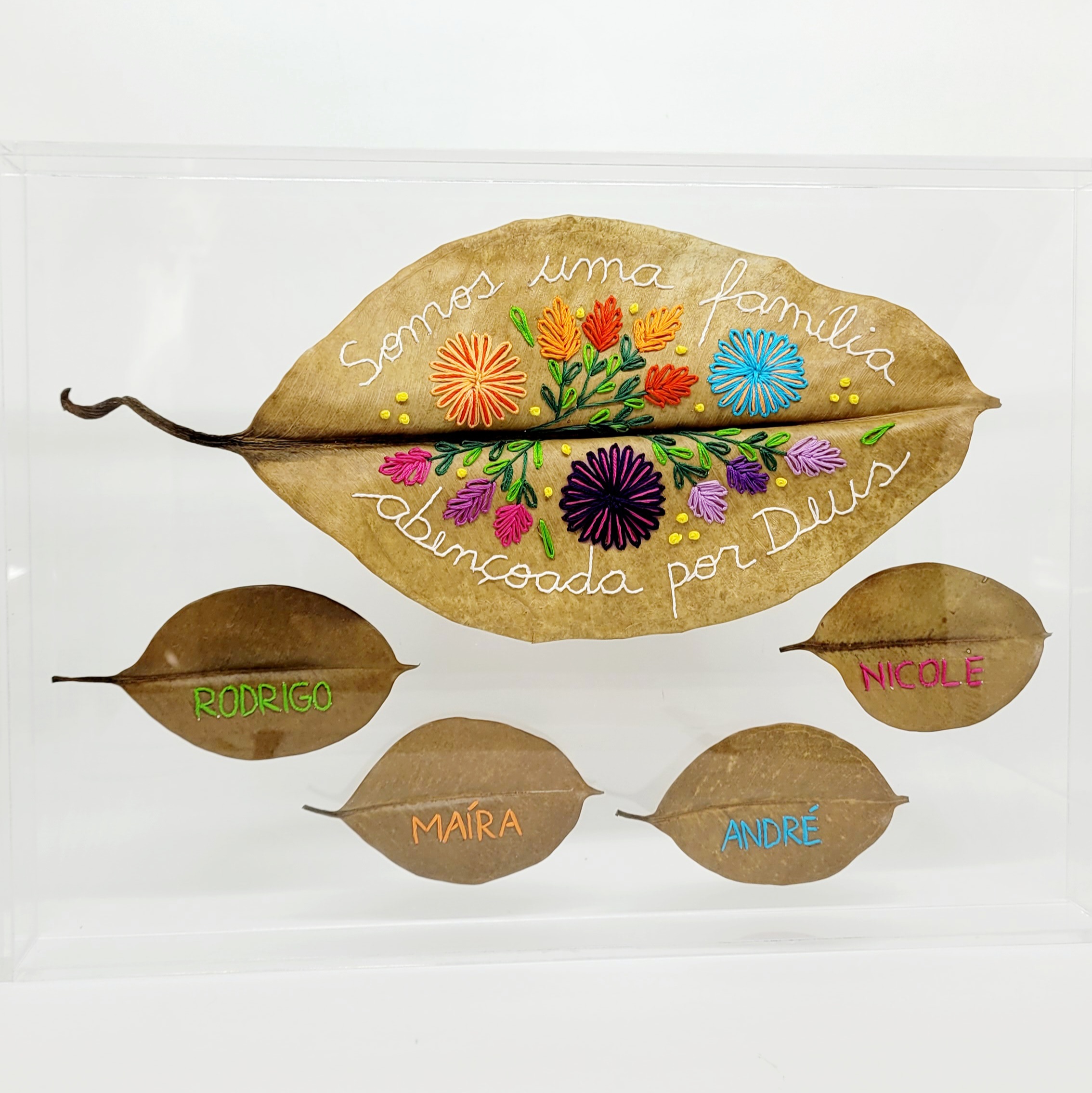 Quadro com folhas diversas bordadas com nomes, frases e floral.