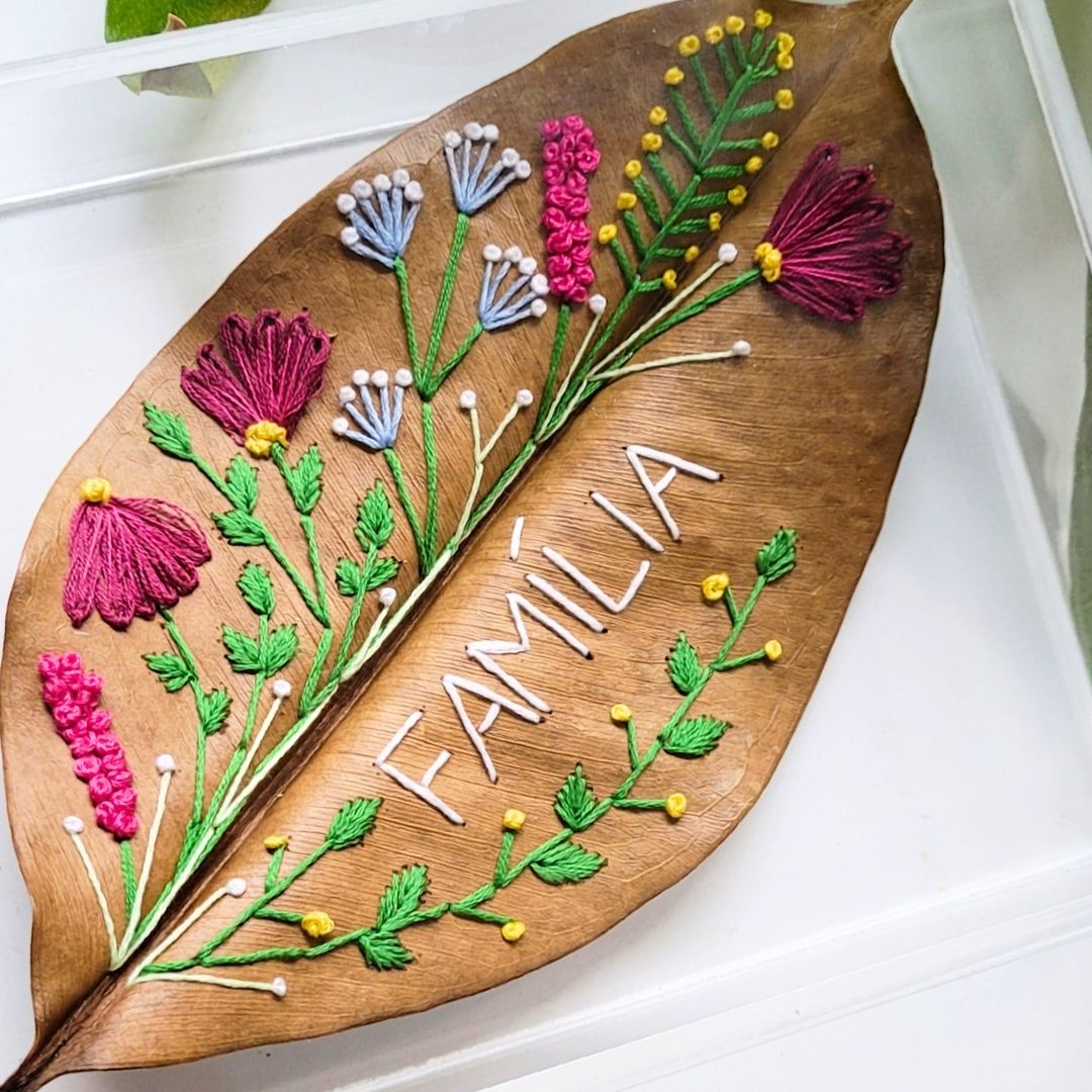 Folha de árvore natural bordada à mão com florais, palavras e cores personalizáveis.
